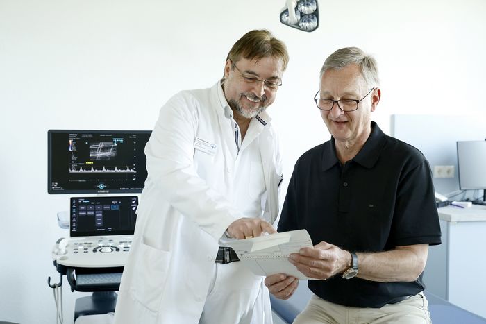 Ein wichtiger Schwerpunkt der Gefäßchirurgischen Praxis des MVZ Rhein-Haardt ist die Diagnostik und Verlaufskontrolle bei Patienten mit einer arteriellen Verschlusskrankheit der Becken- und Beinarterien (PAVK). „Hierzu zählen auch die vielen Menschen mit Diabetes mellitus, die Wunden an den Füßen haben, das sogenannte Diabetische Fußsyndrom“, erklärt Prof. Dr. Rümenapf. In der Hälfte der Fälle bestehe bei ihnen eine PAVK.